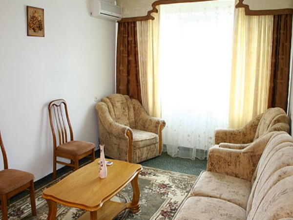 2-х местный номер «Полулюкс» площадью 33 кв.м, комната - 17 кв.м. с мини-кухней - 7,1 кв.м., 3 деревянных кровати, 2 тумбочки, ковер, 2 стула, спутниковое ТВ, кондиционер, фен.