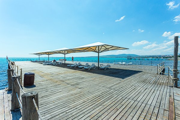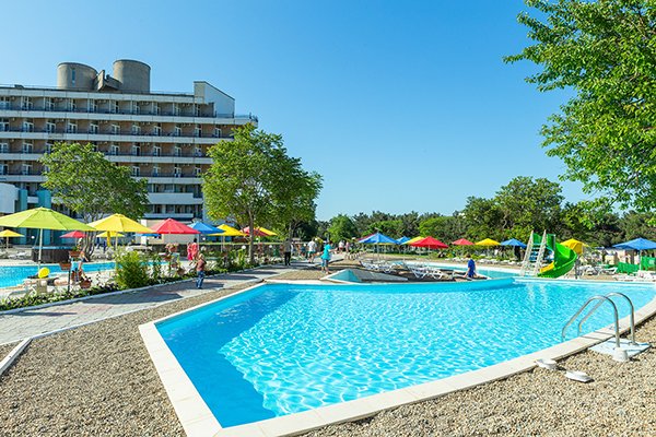 Городской песочный пляж находится в 10-15 минутах хотьбы. Инфраструктура: банкомат, четыре открытых бассейна - взрослый, подростковый, 2 детских с горками, лежаки у бассейнов, магазин пляжных принадлежностей, сувенирный магазин, медицинский центр, медпункт, открытая эстрада со сценой, парковка открытая охраняемая платная, рестораны и бары, бар на игровой террасе, кафе на пляже, столовая, экскурсионное бюро, четыре мини-площадки для игры в волейбол, мини-футбол, бадминтон, снукбол и бесплатный прокат спортивного инвентаря - мячи, ракетки, велосипеды, ролики. Медицинский центр: Принимают врачи: терапевт, педиатр, невролог. Услуги: массаж, грязевые аппликации, ультразвуковые ингаляции, магнитотерапия. Гидротерапия: ванное отделение, душ-шарко, душ циркулярный, подводный душ-массаж.