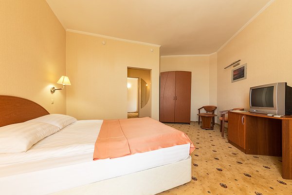 Люкс-Супериор 2-местный 2-комнатный - площадь номера: от 42 кв.мВ номере: двуспальная кровать, 2 прикроватные тумбы, диван, кресло-кровать, журнальный столик, стол, сервант, мини-холодильник, стул, 2 телевизора 40 дюймов, торшер, чайный набор, телефон (внутренняя связь), 2 сплит-системы, встроенный шкаф-купе, сейф, зеркало. В ванной комнате: душевая кабинка, полотенцесушитель, зеркало, зеркало косметическое, фен, комплект полотенец (банное, для лица, для рук, для ног), халат и тапочки (на основные и доп. места от 12 лет), гостиничная