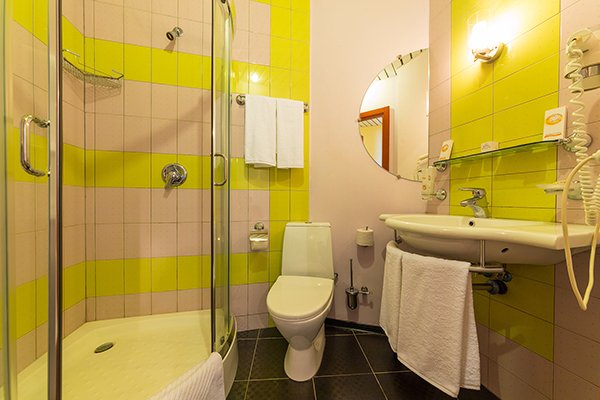 Стандарт 1-местный 1-комнатный - Общая площадь номера: от 15 кв.м. Расположение номера: корпус №2. В номере: двуспальная кровать, шкаф (10 плечиков для одежды), тумба под телевизор, стол туалетный, 2 прикроватные тумбы, 1 стул, пуфик, лампа настольная, подчемоданник, телефон, мини- холодильник, телевизор, сплит – система. В ванной комнате: душевая кабинка, зеркало, фен, комплект полотенец (банное, для лица, для рук, для ног), гостиничная косметика, шапочка для душа, гигиенические пакеты.
