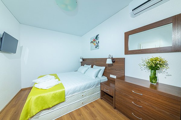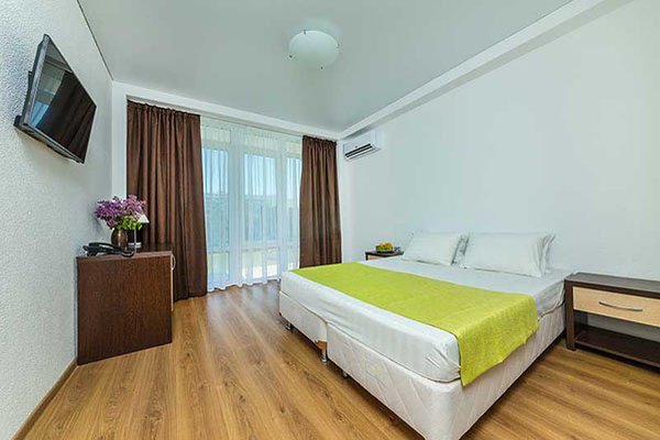 2-местный стандарт улучшенный 1 категории макс. 2+1 чел., 22 кв. м, телевизор, сплит-система, фен, тапочки, пляжное полотенце, сейф, телефон, 2-спальная кровать, журнальный столик, шкаф, стол, раковина, мини-холодильник, душевая кабина/ванна, стулья. Доп. место - кресло-кровать, может быть установлено без ограничения по возрасту.