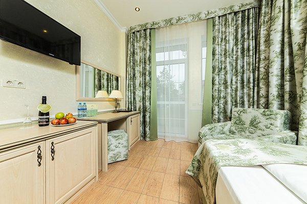 Одноместный номер "Стандарт"- односпальная кровать, прикроватные тумбочки, кресло-кровать, шкаф, стол, тумба, багажная тумба, вешалка, пуфик, зеркало, сплит-система, сейф, телевизор ЖК, мини-холодильник, телефон, санузел с душевой кабиной, фен, туалетные принадлежности, халат, тапочки, таз, телефон, балкон оборудован сушилкой, бутилированная вода в номере, Wi-Fi входящий в стоимость, рум-сервис до 02.00 часов, услуги телефонной связи по территории отеля, услуги местной телефонной связи.