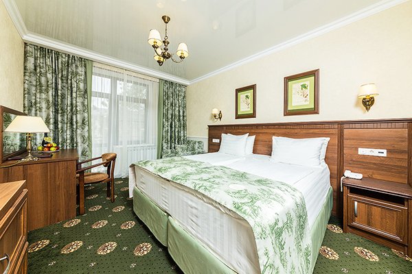 Двухместный номер "Стандарт" - две односпальные кровати или одна двуспальная кровать, прикроватные тумбочки, 2 кресло-кровати или диван и кресло-кровать, шкаф, стол, журнальный столик, тумба, багажная тумба, вешалка, пуфик, зеркало, сплит-система, сейф, телевизор ЖК, мини-холодильник, телефон, санузел с душевой кабиной, фен, туалетные принадлежности, халат, тапочки, таз, телефон, балкон оборудованный сушилкой, бутилированная вода в номере, Wi-Fi входящий в стоимость, рум-сервис до 02.00 часов, услуги телефонной связи по территории отеля, услуги местной телефонной связи.