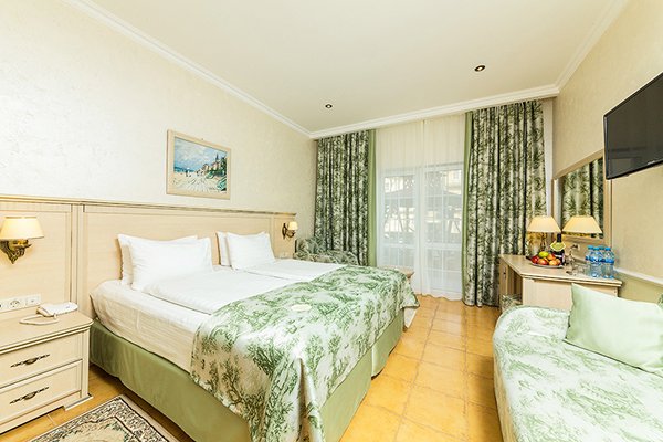 Двухместный двухкомнатный номер «Люкс-Макси» - две односпальные кровати или одна двуспальная кровать, прикроватные тумбочки, раскладной диван, кресла, шкаф, стол, 2 журнальных столика, тумба, багажная тумба, вешалка, пуфик, зеркало, сплит-система, сейф, телевизор ЖК, мини-холодильник, телефон, санузел с душевой кабиной, с ванной, фен, туалетные принадлежности, халат, тапочки, таз, биде, телефон, балкон оборудованный сушилкой, бутилированная вода в номере, Wi-Fi входящий в стоимость, рум-сервис до 02.00 часов, услуги телефонной связи по территории отеля, услуги местной телефонной связи.