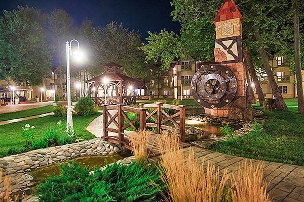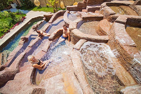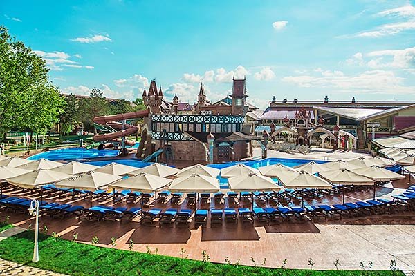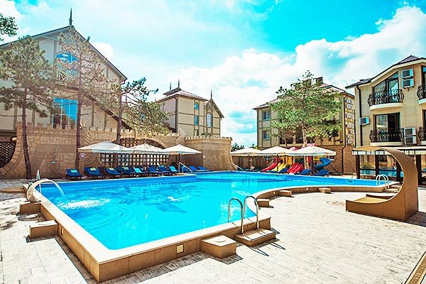 Бассейны: крытый расположенный в СПА комплексе с пресной, минеральной водой - пользование бассейном оплачивается дополнительно, работает круглогодично, открытый расположен рядом с рестораном "Кальвадос" площадью 170 кв.м., объемом - 210 куб.метров, с подогреваемой пресной водой, с детским отделением, горками - пользование бассейном входит в стоимость - работает сезонно с 01.06. по 15.06., комплексом бассейнов - четыре бассейна под открытым небом: с подогревом воды, водными горками для гостей всех возрастов, детской зоной купания и анимационной эстрадой. Объем 625,3 куб.метров.