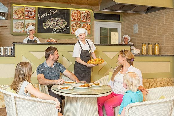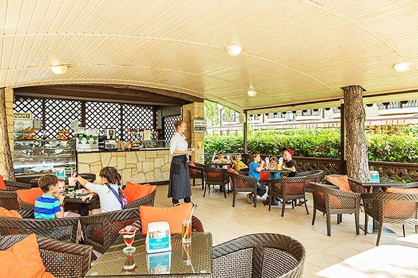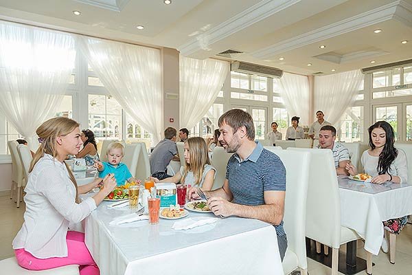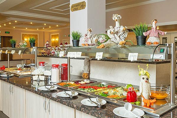 Рестораны и бары: основной ресторан «Кальвадос» на первом этаже корпуса, европейская кухня - работает с 08.00 до 02.00, обеденный зал в корпусе рядом с анимационным бассейном - работает с 07.00 до 20.30, лобби-бар на первом этаже корпуса, холодные закуски, салаты, десерты, алкогольные и прохладительные напитки, обширная чайная и кофейная карта - работает круглосуточно, коктейль-бар у бассейнов - работает с 10.00 до 24.00, караоке-бар у бассейна на втором этаже с японской кухней - работает с 20.00 до 02.00, фито-бар в СПА комплексе - работает с 9.00 до 21.00 в летнее время, с 10.00 до 22.00 в зимнее время, пиццерия рядом с анимационным бассейном - работает 10.00 до 22.00.