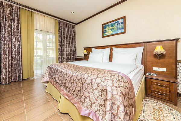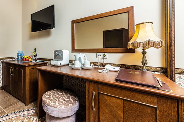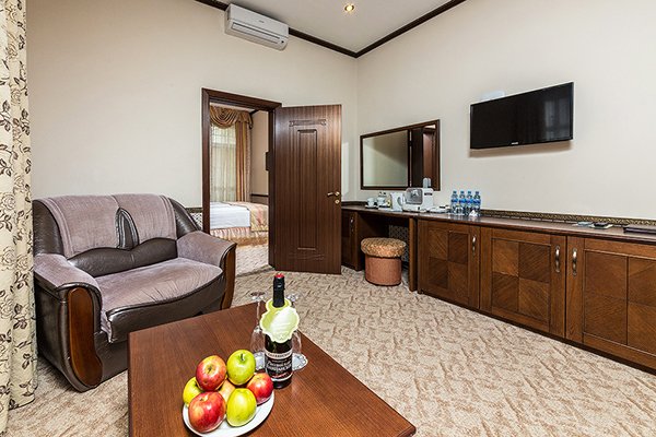 Двухместный двухкомнатный номер «Люкс-Мини» - две односпальные кровати или одна двуспальная кровать, прикроватные тумбочки, 2 кресло-кровати или диван и кресло-кровать, шкаф, стол, журнальный столик, тумба, багажная тумба, вешалка, пуфик, зеркало, сплит-система, сейф, телевизор ЖК, мини-холодильник, телефон, санузел с ванной, фен, туалетные принадлежности, халат, тапочки, таз, телефон, балкон оборудованный сушилкой, бутилированная вода в номере, Wi-Fi входящий в стоимость, рум-сервис до 02.00 часов, услуги телефонной связи по территории отеля, услуги местной телефонной связи.